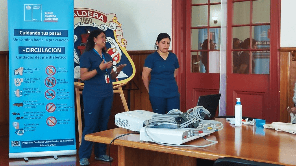 Las funcionarias del Centro de Salud Familiar de Caldera Lery Urtubia (encargada del área de curaciones y programa de úlcera de pie diabético ) y Joselyn alday (encargada del programa de atención domiciliaria de paciente de dependencia severa), postularon a un proyecto del Servicio de Salud de Atacama para la adquisición de una máquina para monitorear el Índice Tobillo y Brazos (ITB), que permitirá medir la presión arterial sistólica bilateral en pacientes con diabetes, hipertensión, dislipidemia y edad avanzada. La máquina de ITB tiene un valor de 3 millones, un proyecto postulado por medio de fondos concursables de iniciativas comunitarios del Servicio de Salud Atacama cuyo valor fue de 6 millones de pesos y que además permitió adquirir materiales educativos y kits de autocuidado entregados a las personas participantes. Este proyecto fue presentado a las autoridades locales encabezados por la alcaldesa Brunilda González, el concejal Natán Pereira, la directora de Salud Municipal, Daniela Carrasco, la directora del CESFAM, María José Angulo, junto a dirigentes y representantes de las organizaciones sociales que formaron parte del desarrollo del proyecto. Lery Urtubia, funcionaria encargada policlínico de curaciones Cesfam, señaló “Nosotros estuvimos trabajando con seis Juntas de Vecinos de vecinos y una Iglesia, esta máquina la adquirimos mediante las iniciativas comunitarias que nos ganamos por el Servicio de Salud, que cuenta de seis millones, esta máquina ITB que mide la presión de los brazos y de las piernas para ver cómo fluye la sangre de las extremidades inferiores y así nosotras prevenir alguna herida o un mal pronóstico de esta herida de los pacientes, aparte esta máquina va con educaciones, que es de sobre las úlceras venosas, sobre el cuidado del pie diabético, cuesta bastante que el paciente diabético deje la chalita de goma, concurra al control metabólico, pero hay que seguir con ello y no abandonarlo”. Las funcionarias de salud realizaron un gran trabajo comunitario con las vecinas y vecinos de sectores vecinales como; Unión Comunal de Adultos Mayores, Iglesia Evangélica de Dios Pentecostal y las Juntas de Vecinos Altos de Atacama, Candelaria, Nueva Caldera Norte y Claudio Arrau, entregando su vocación de servicio a la comunidad a cerca de 100 personas quienes con estas acciones fortalecen la participación activa de la comunidad en acciones de promoción de la salud y prevención de enfermedades. La enfermedad arterial periférica (EAP) de las piernas afecta a un 13% de las personas de 50 años de edad. A veces la EAP es "silenciosa" y los pacientes no son conscientes de la misma, aunque puede causar dolor en las piernas, especialmente al caminar. María José Angulo, directora del Cesfam, manifestó “Principalmente este es un proyecto que va orientado a la prevención de usuarios con factores de riesgo, en los cuales podamos detectar oportunamente alguna alteración en su circulación y que claramente al poder detectarlo oportunamente poder hacer el tratamiento oportuno o derivaciones oportunas para evitar riesgos a futuros como amputaciones, heridas, que finalmente también al no cicatrizar oportunamente o rápidamente puedan generar también otros riesgos a futuro de nuestros usuarios. Entonces claramente estos proyectos que van orientado y muy de la mano con el trabajo con la comunidad tienen un sentido, un realce, que es qué acciones vengan desde afuera y no desde los equipos hacia la comunidad y eso claramente nos hace sentir muy orgulloso no sólo del equipo de salud sino también de la participación de nuestros usuarios y usuarias de la comunidad de Caldera”. Mediante su visita a los sectores vecinales entregaron educación a vecinos y vecinas sobre pie diabético, úlcera venosa y autocuidado, además de entregar de kits de autocuidado, mientras que los resultados fueron ingresados a una plataforma digital, desarrollada junto al Departamento de Informática de la Municipalidad, permitiendo un seguimiento continuo y derivaciones oportunas a atención médica especializada.
